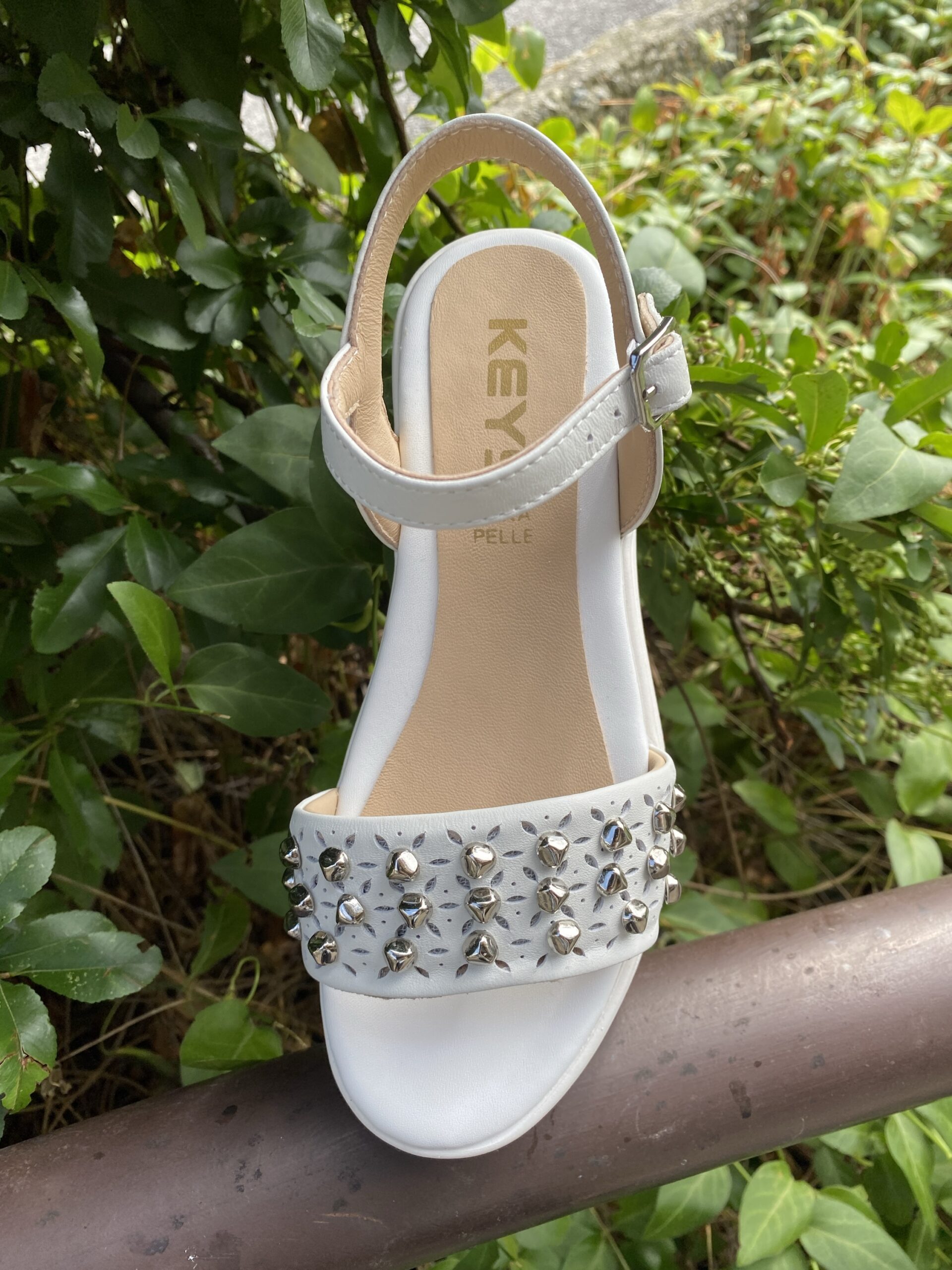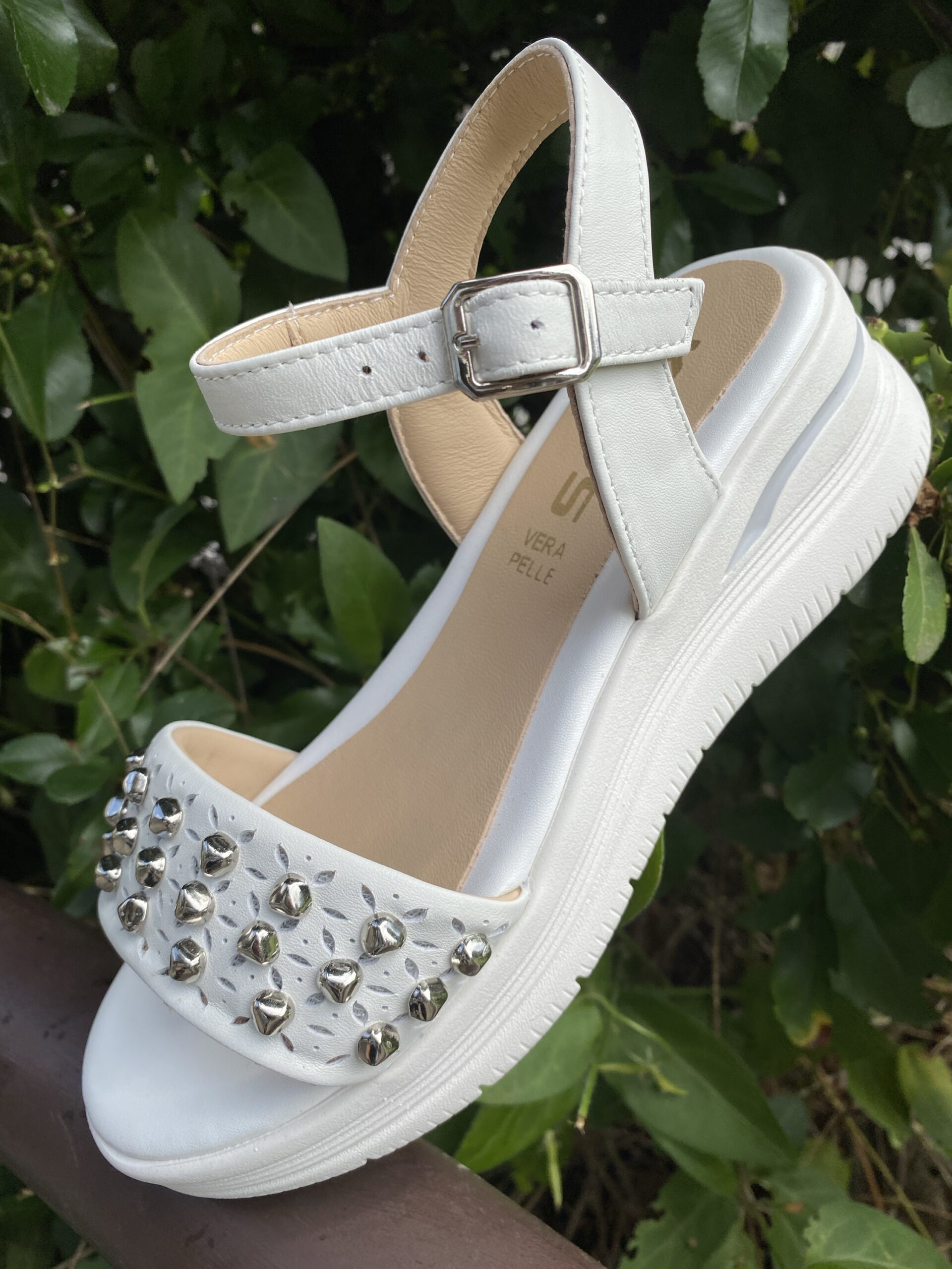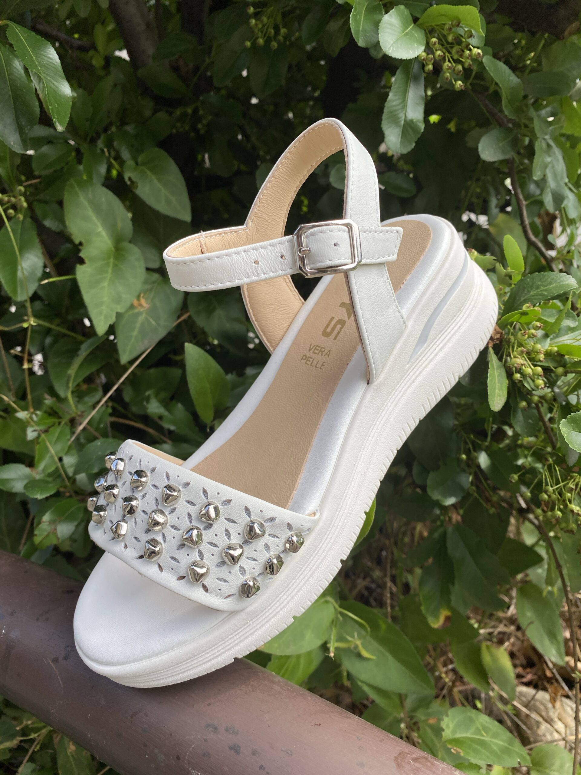 Sandalo color bianco con cinturino con borchie color argento cinturino alla caviglia regolabile zeppa 4 cm