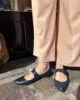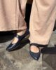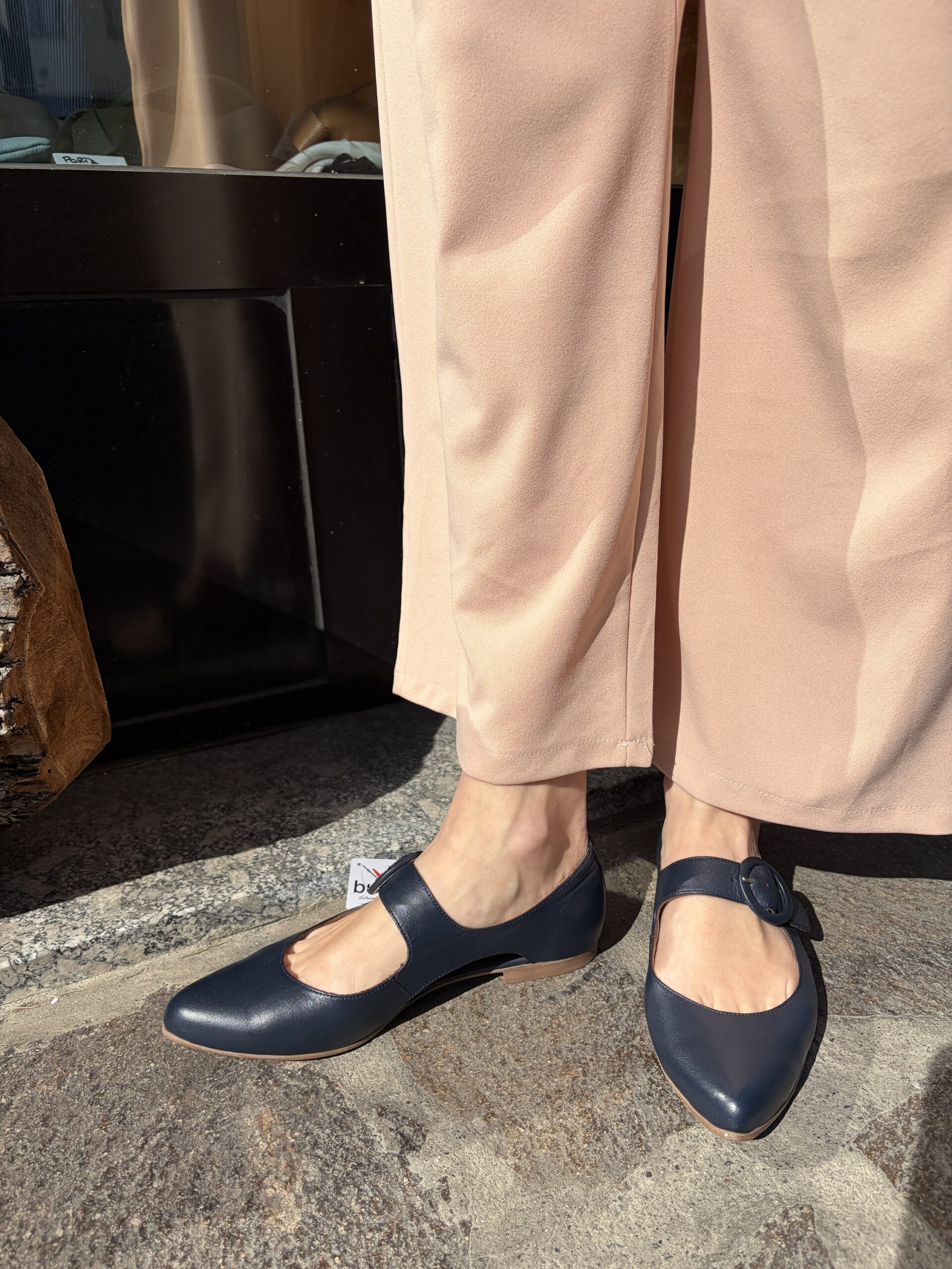Ballerina con punta tutta in pelle sottopiede in pelle blu cinturino regolabile