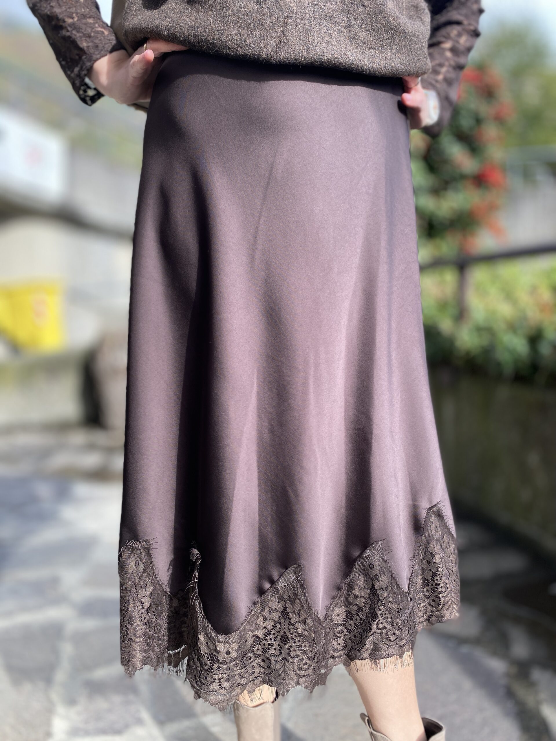 Gonna lunga svasata in raso con orlo in pizzo vita alta con elastico