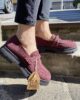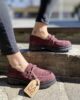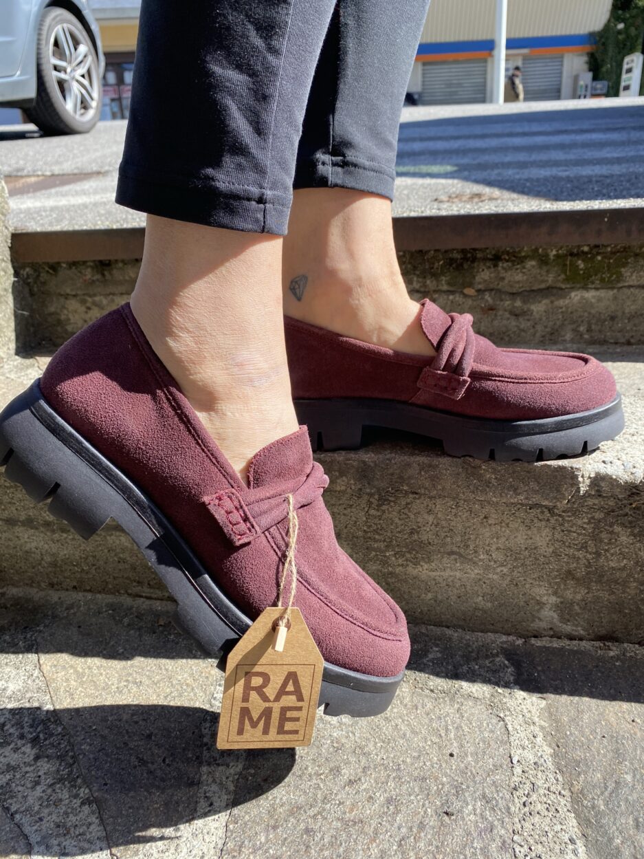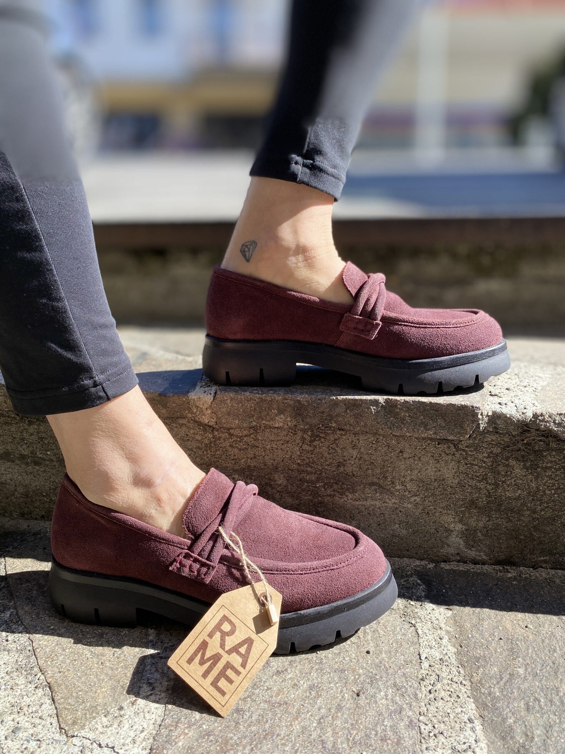 Mocassino in camoscio bordeaux con sottopiede in re soft fondo in gomma