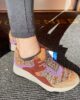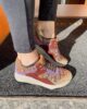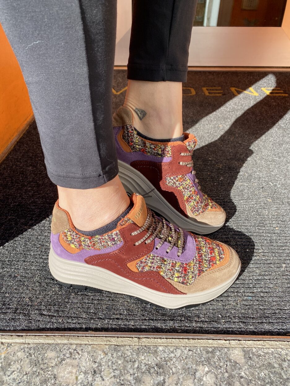 Sneaker in pelle con sottopiede re soft estraibile tomaia in pelle e packwork bordeaux arancio e tortora
