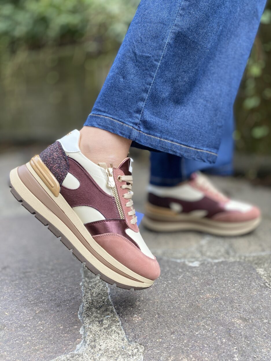 Sneaker in pelle color caramello e crema e bianca con profilo bordeaux
